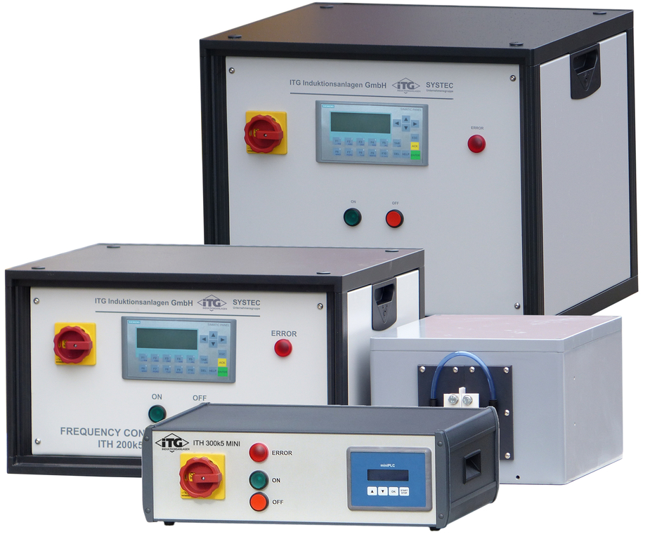 Der Mittelfrequenz-Umrichter ist in IGBT-Technologie mit kompakten Komponenten aufgebaut. Hier können Arbeitsfrequenzen von 6 bis 100 kHz bei einer Leistung bis 25 kW als Tischgerät und bis 50 kW in Schrankbauweise erreicht werden.